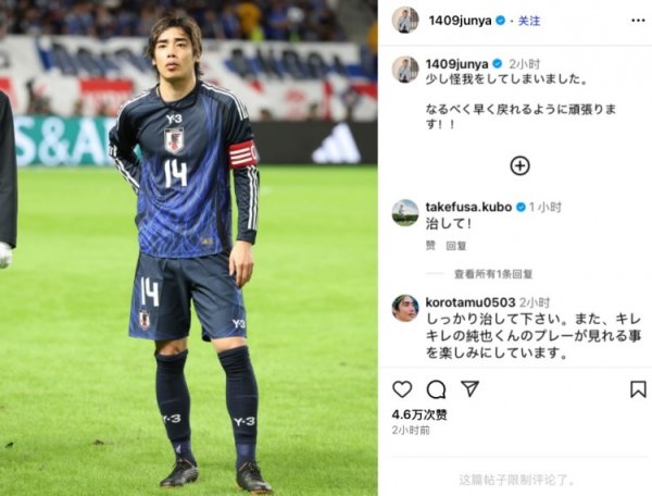 10月15日讯 据日媒Sponichi等的报说念,在昨晚助攻梅开二度帮日本队3-2历史性打败巴西队后,伊东纯也莫得袭取采访,而是直接前去病院查验右脚伤势。 本日伊东纯也更新社媒发扬伤情,他写说念:“受了少量小伤。我会戮力还原,尽快复返赛场!” 南野拓实、久保建英为这条社媒点赞,久保建英还奉上祈福:“尽快康复!”......