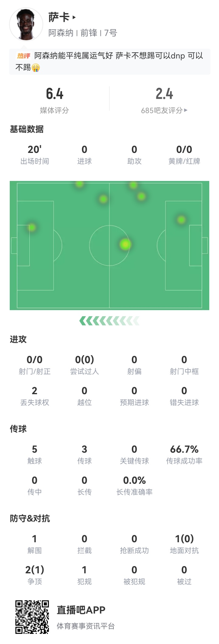 本场在不太多的登场本领里,萨卡证明寥寥,只好5次触球,此外他在多项贫瘠数据上齐是挂零景况。