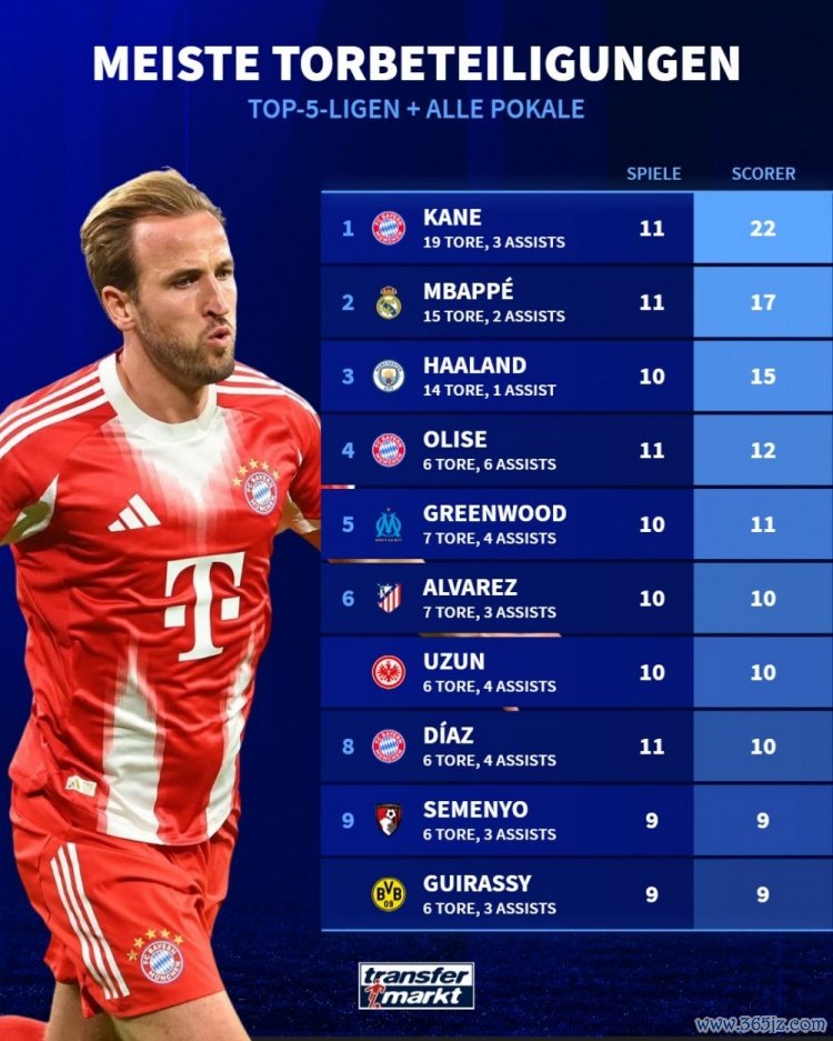 10月20日讯 《转会市集》统计了本赛季五大联赛球员在俱乐部各项赛事的胜仗参与进球总和情况,凯恩、姆巴佩、哈兰德分列前三。