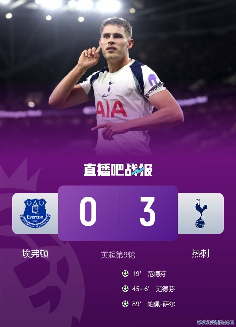 英超第9轮,热刺客场3-0轻取埃弗顿,范德芬梅开二度。