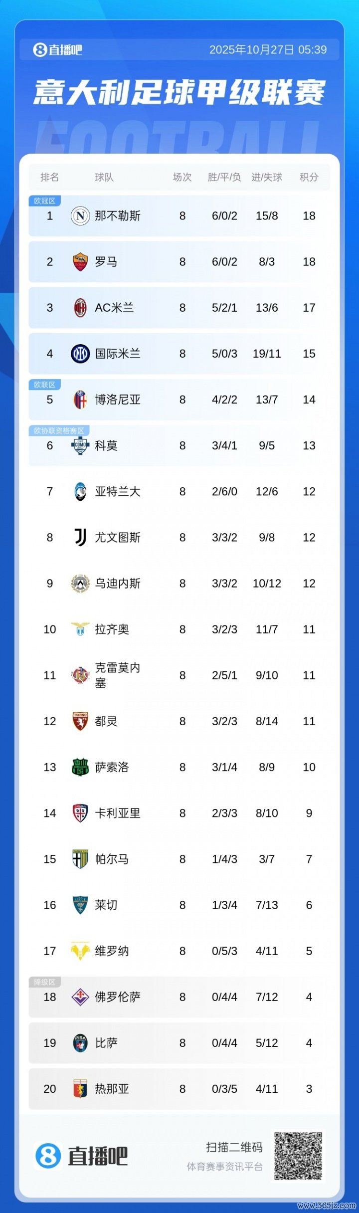 意甲积分榜:那不勒斯、罗马同分前二,尤文掉至第八