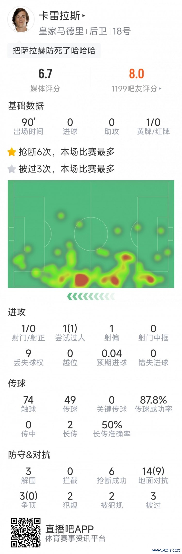 主防萨拉赫,卡雷拉斯本场数据:6次抢断,3次突围,9次生效抗争