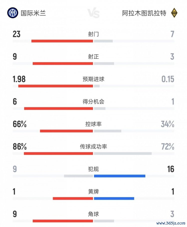 国米vs凯拉特数据:射门23比7、得分契机6比1、控球率66%比34%