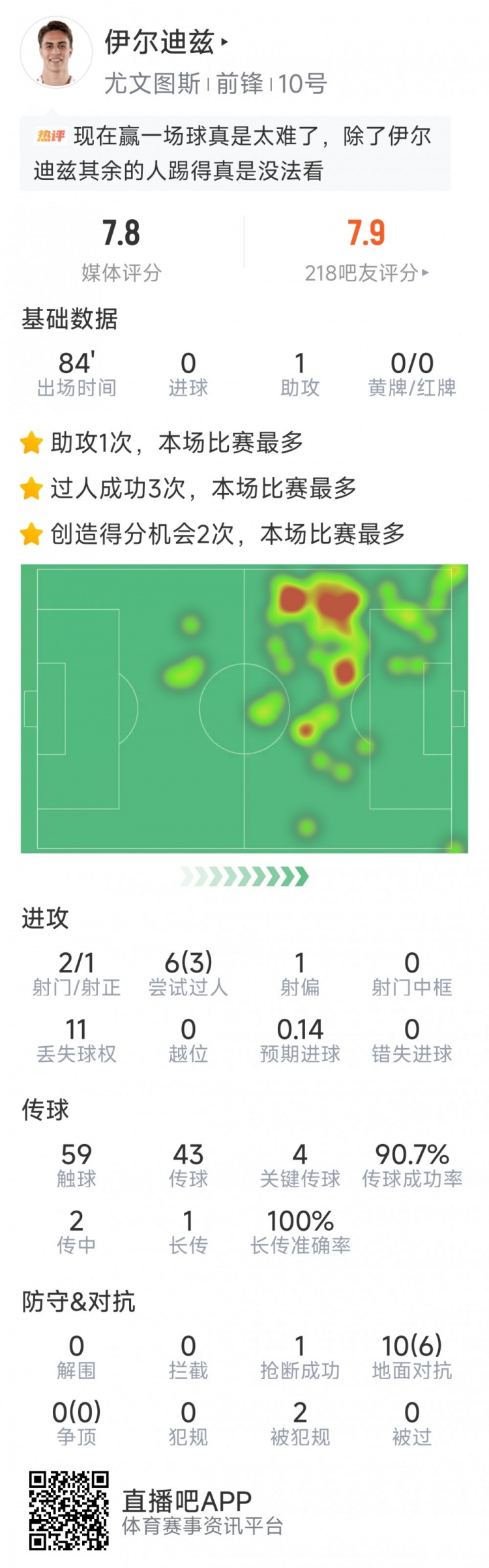 伊尔迪兹本场数据:1次助攻,4次要津传球,2射1正,3次过东谈主