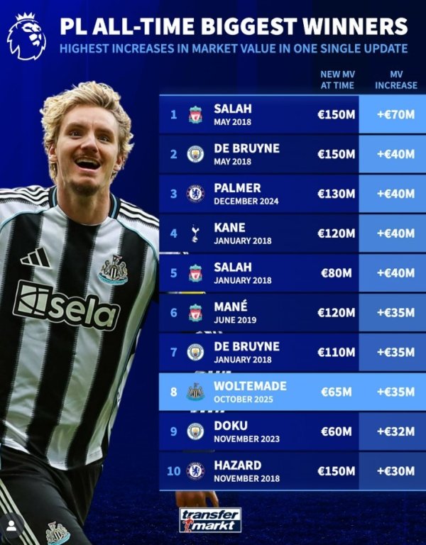 10月20日讯 德转此前更新了足坛球员身价,并清点了英超球员在单次更新中身价涨幅最高的榜单,具体如下: 1、萨拉赫,2018年5月,1.5亿欧,+7000万欧 2、德布劳内,2018年,1.5亿欧,+4000万欧 3、帕尔默,2024年,1.3亿欧,+4000万欧 4、凯恩,2018年,1.2亿欧,+4000万欧 5、萨拉赫,2018年1月,8000万欧,+4000万欧 6、马内,2019年,1.2亿欧,+3500万欧 7、德布劳内,2018年1月,1.1亿欧 ,+3500万......
