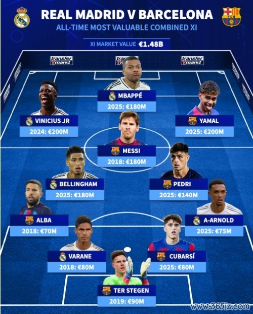 10月24日讯 本周末,西甲将献艺万众郑重标西班牙国度德比。德国转会市集盘货了皇马和巴萨球员历史身价最高阵,梅西、姆巴佩、亚马尔等总共在列。 以下为具体声威(总身价:14.8亿欧元) 门将:特尔施特根(2019年,9000万欧元) 后卫:阿尔巴(2018年,8000万欧元)、瓦拉内(2018年,8000万欧元)、库巴西(2025年,8000万欧元)、阿诺德(2025年,7500万欧元) 中场:贝林厄姆(2025年,1.8亿欧元)、梅西(2018年,1.8亿欧元)、佩德里(20......