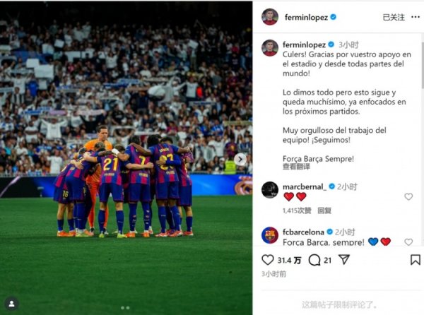 10月27日讯 西甲第10轮比赛,巴萨客场1-2不敌皇马。 此役费尔明为巴萨破门,赛后他在酬酢媒体上写谈:“巴萨球迷们!感谢你们在球场和全国各地的复旧!” “咱们倾尽全力,但征途仍在持续,改日还有好多比赛,此刻咱们照旧专注于接下来的比赛。为球队的勤恳感到无比自爱,持续前进!巴萨始终前进!”......