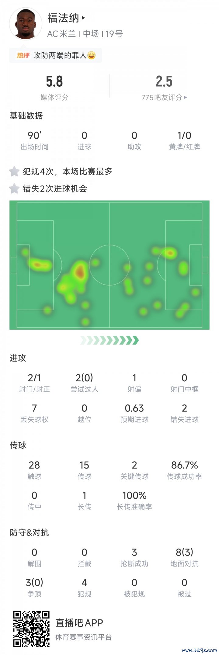 扎眼端福法纳只好3次抢断,其他数据均欠安,他犯规4次,8次大地抗拒3告捷,3次争顶0告捷,0突围0防止。最让球迷崩溃的则是比赛第79分钟,先送即兴球,再送点球,要不是迈尼昂勇猛,米兰球门果决失守。