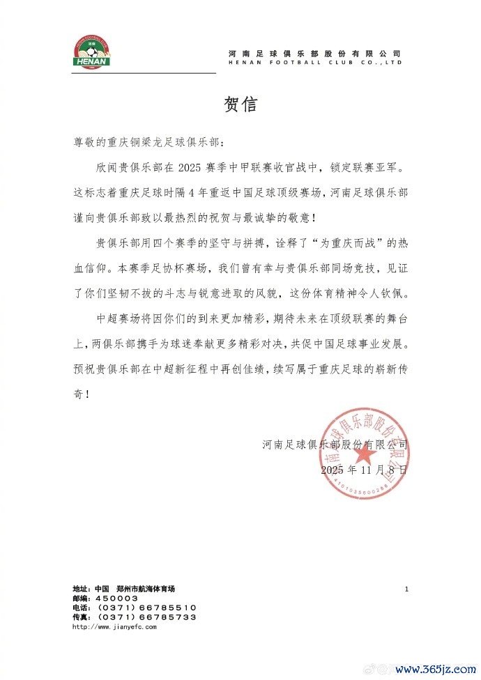 欣闻贵俱乐部在2025赛季中甲联赛收官战中,锁定联赛亚军。这标识谨防庆足球时隔4年重返中国足球顶级赛场,河南足球俱乐部谨向贵俱乐部致以最强烈的祝愿与最忠实的敬意!