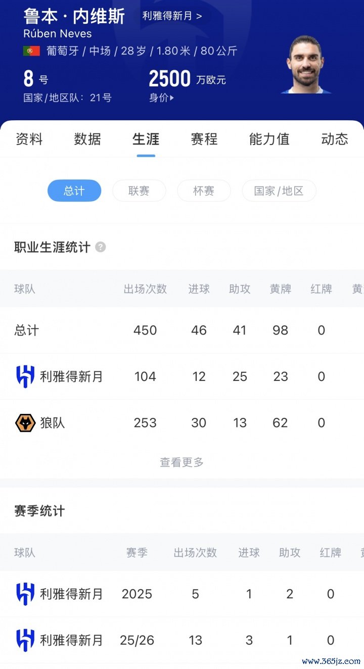 内维斯在2023年的夏窗以5500万欧的转会费从狼队加盟利雅得眉月,他当今的契约在2026年6月30日到期,球员当今身价2500万欧,本赛季他代表球队出战18场比赛孝敬4球3助,是球队的贫寒球员。