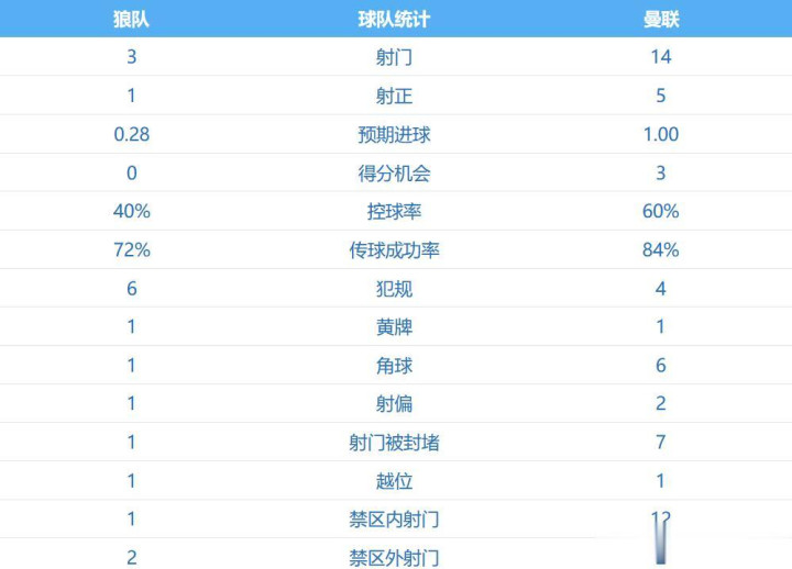 上半场曼联队的上风相当显著,射门14-3、射正5-1,只能惜比分未能超过,控球率方面,曼联队60%相似占优。