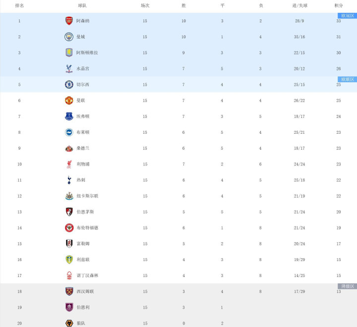 最新的英超积分榜!阿森纳2-0布伦特福德