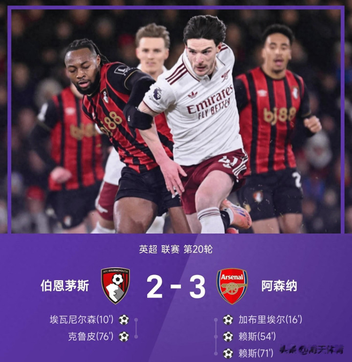 1月4日英超联赛第20轮比赛,伯恩茅斯主场迎战阿森纳,最终两边激战90分钟,阿森纳3-2逆转伯恩茅斯豪取5连胜,全场比赛赖斯发达出色完成了双响,加布里埃尔破门立功,伯恩茅斯埃瓦尼尔森开场10分钟完成了闪击破门,克鲁皮鄙人半场完成了寰宇波。本轮事后,在先赛的情况下阿森纳48分领跑阿斯顿维拉6分!