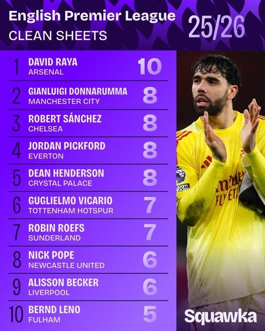 本赛季英超零封榜: 拉亚10场最多, 多纳鲁马、桑切斯等4东谈主均8场