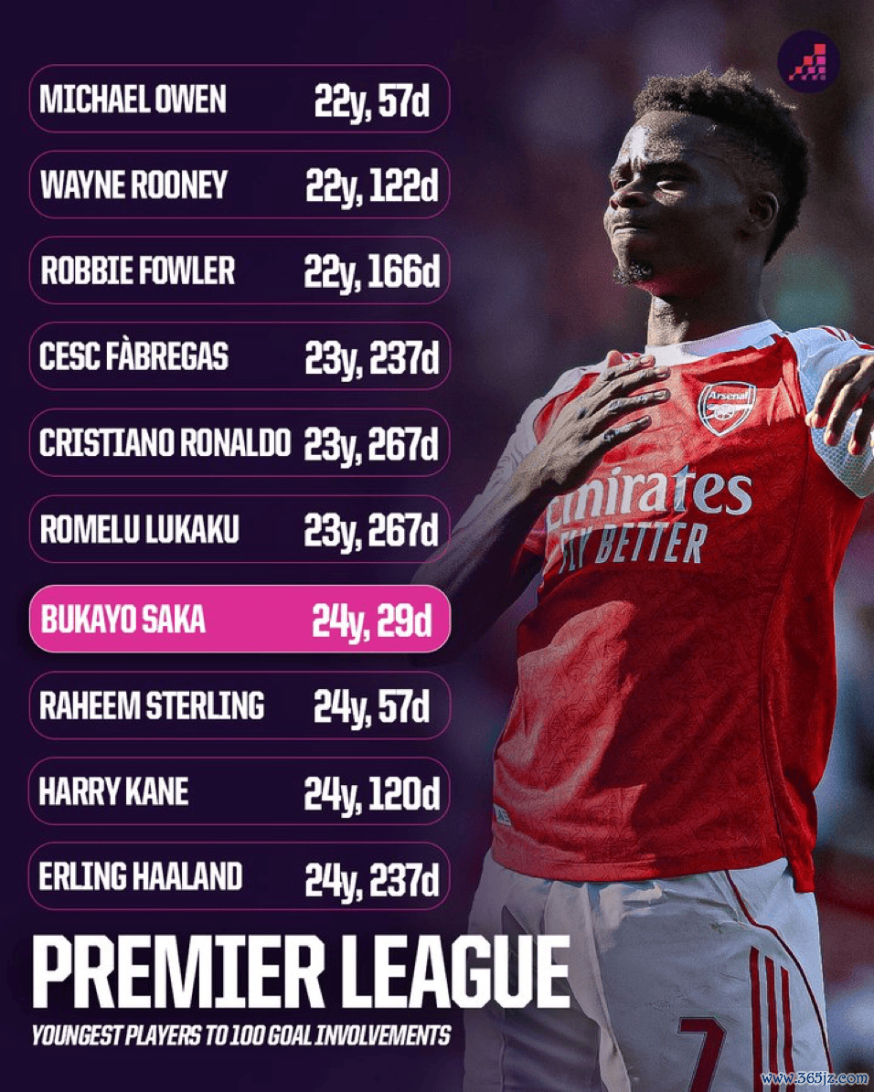英超历史最快扫尾参与百球的球员: 欧文最年青, 萨卡名挨次7