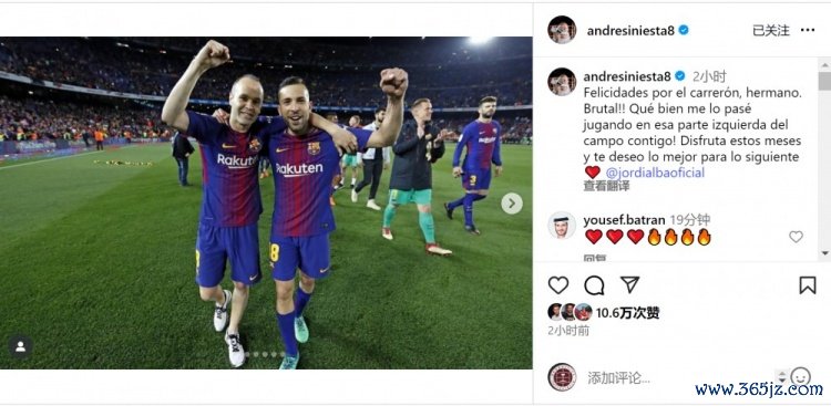10月8日讯 阿尔巴将在本赛季末端后退役,老队友伊涅斯塔社媒发文祝贺。