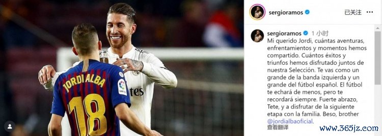 10月8日讯 西班牙边卫阿尔巴将在本赛季收尾后退役,拉莫斯社媒发文致意。