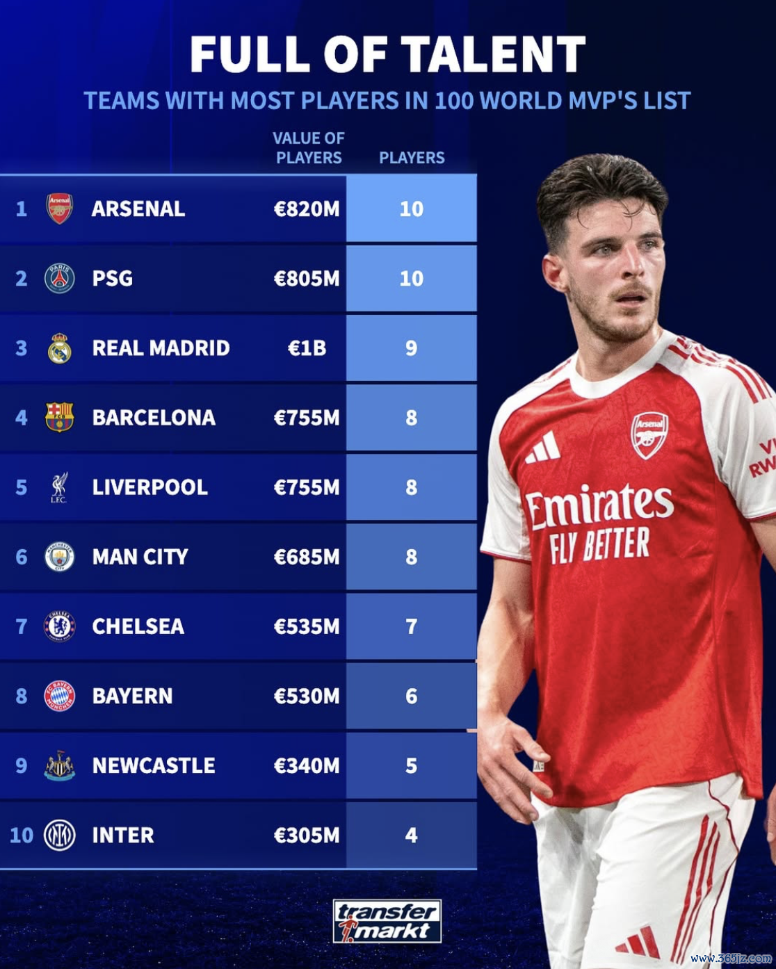 阿森纳和巴黎辞别领有10名球员位居一二。皇马固然因为领有9名球员名挨次三,但球员总身价10亿欧排居首。
