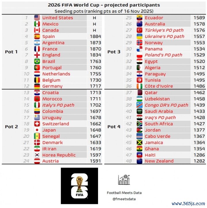 11月17日讯 世初赛激战正酣,现辞天下杯48支参赛队已笃定32席,数据机构Football Meets Data左证现存天下名次给出了最新的天下杯分档预料。