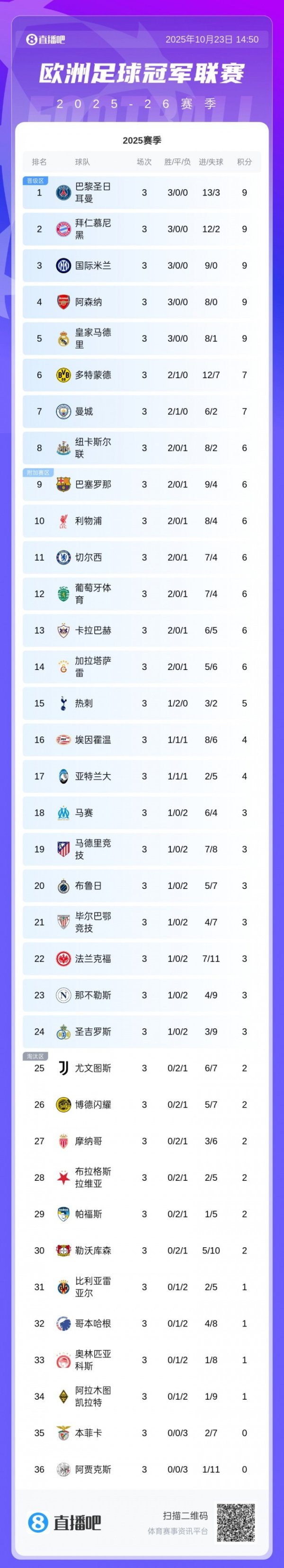 北京时候10月23日,2025-26赛季欧冠联赛阶段第3轮再赛9场。在一场强强对话中,皇马1-0力挫尤文。拜仁则横扫布鲁日,与皇马联袂开局3连胜。利物浦、切尔西本轮也都斩获5-1大捷,热刺则在客场被摩纳哥逼平。 皇家马德里1-0尤文图斯 第40分钟,姆巴佩近距离敲门被迪格雷戈里奥骁勇化解。第50分钟,弗拉霍维奇奔袭后单刀也被库尔图瓦化解。 第57分钟,维尼修斯1v3突破射门中柱, 贝林厄姆补射突破僵局。第71分钟,迪格雷戈里奥邻接挡出姆巴佩和迪亚斯近距离必进球。第87分钟,阿......