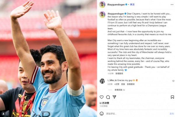 9月3日讯 34岁的德国中场京多安一经官宣加盟加拉塔萨雷,他也通过社媒发布了向曼城的告别信: 亲爱的城民们,我思对你们坦诚相告...我离开的原因十分通俗:我依然渴慕尽可能多地参预比赛,因为这长久是我最阻拦的事。虽行将年满35岁,但我仍嗅觉景色上佳,并笃信我方能在欧冠球队抓续孝顺高水平领路。 不仅如斯——如今我有契机加入儿时最喜爱的俱乐部,前去一个对我道理道理超卓的国家。 在履历光芒期间后,曼城但愿开启新篇章——我皆备交融并尊重这个决定。我永远永远不会健忘这家伟大俱乐部多年来为......