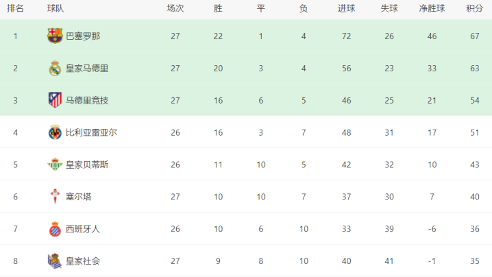 在联赛排名榜上,巴萨联赛排名榜首。巴萨球队球队表现是22胜1平4负,拿到67分。而只拿到63分的皇马联赛排名第2,落后巴萨4分。马竞赢球之后,总积分达到54分,联赛排名第3,与身前的两支队伍差距依然很大。比利亚雷亚尔以51分联赛排名第4。第5的是皇家贝蒂斯,拿到了43分。