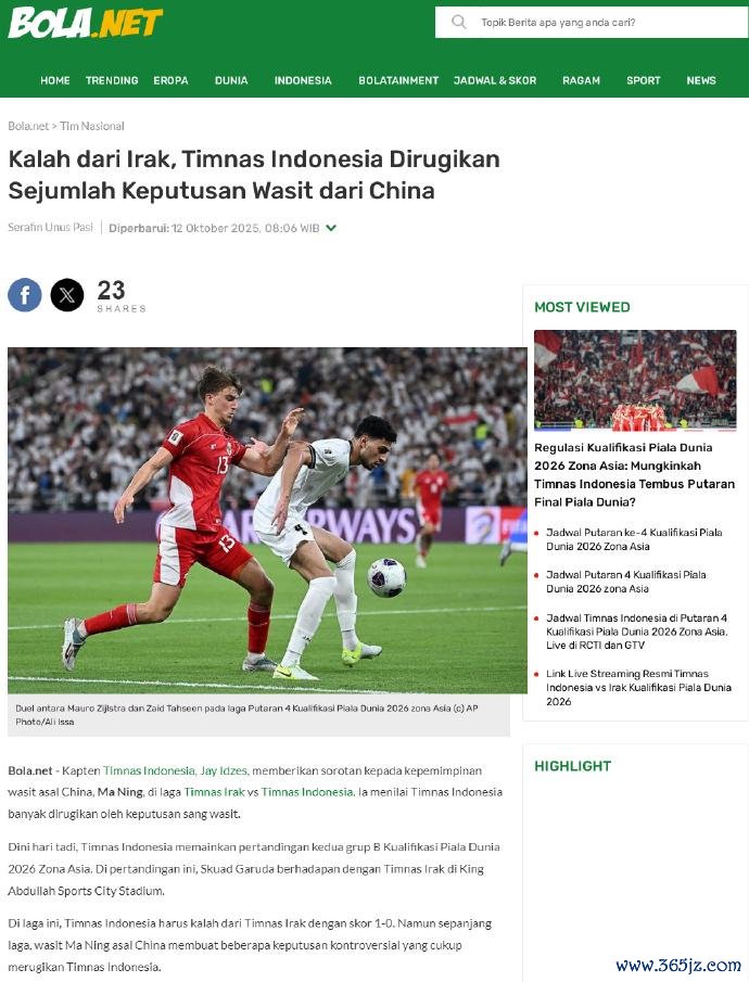 在这场比赛里,马宁依旧保抓了过往“卡牌群众”的形象,整场比赛,他一共出示了7张黄牌和1张红牌,其中有6张黄牌给了印尼队,1张黄牌和1张红牌,全给了伊拉克队的中卫塔赫辛。尽管一度让球队领有了东谈主数上的上风,但关于马宁的吹罚,印尼媒体还横蛮常不悦。赛后,印尼媒体《BOLA》就公开荒文称“在比赛里,中国的主裁判马宁作念出了好屡次极具争议的判罚,而这些判罚的获益者,王人是伊拉克队,印尼队因此受到了雄伟的影响!”