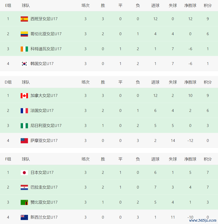 北京时分10月26日凌晨,新一届U17女足天下杯小组赛终末一个比赛日,D组、F组适度的总共比赛,法国1-2输给加拿大、尼日利亚4-0大捷萨摩亚、日本1-1绝平巴拉圭、新西兰0-4惨败赞比亚。至此,各组的最终积分榜和晋级淘汰赛的球队一说念出炉。