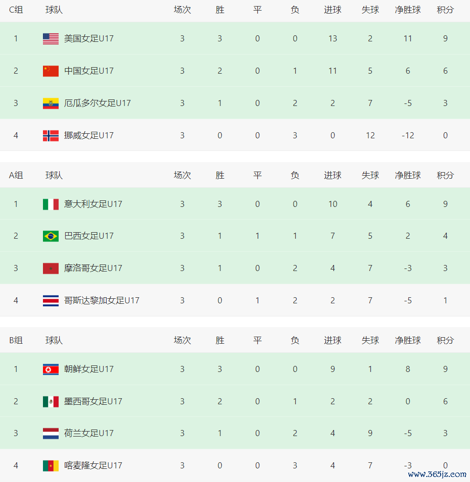 北京技能10月26日凌晨,新一届U17女足宇宙杯小组赛终末一轮,D组、E组、F组的比赛一齐界限,十六强席位一齐产生,具体为:意大利、巴西、朝鲜、墨西哥、好意思国、中国女足、西班牙、、法国、加拿大、日本、巴拉圭、哥伦比亚、荷兰、赞比亚、尼日利亚。